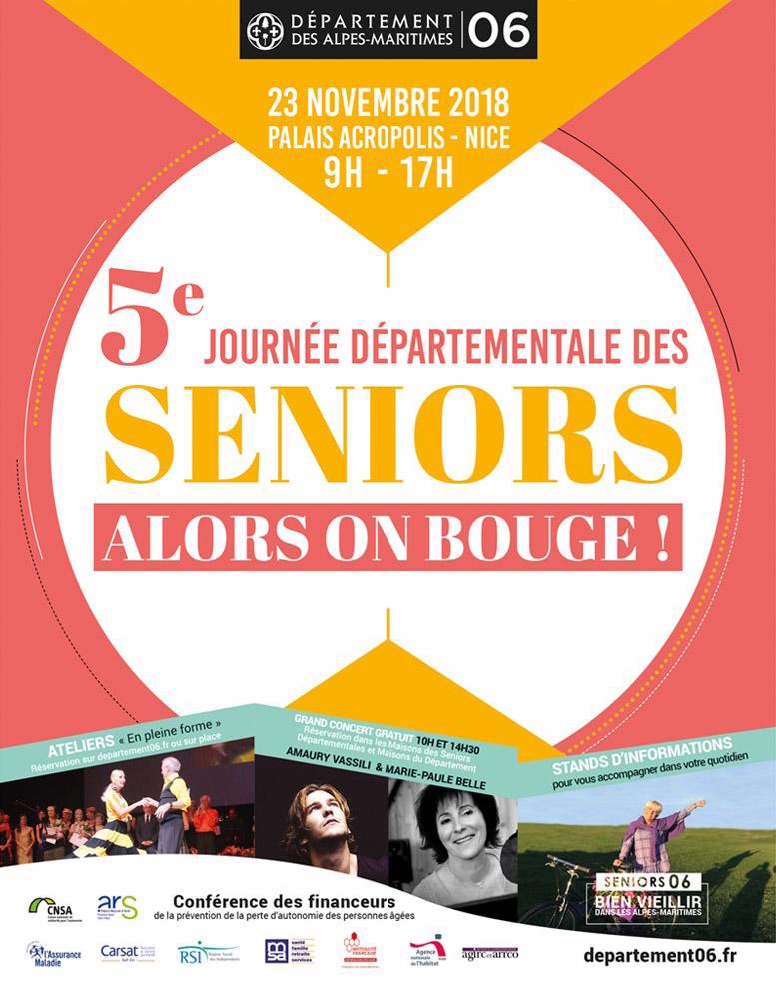 « Alors on bouge ! » – Vendredi 23 novembre 2018 à 9 heures, Charles Ange Ginésy, Président du Département des Alpes-Maritimes, vous convie à la 5ème journée départementale des seniors, en présence d’Eric Ciotti, Député, Président de la commission des finances du Département des Alpes-Maritimes, et de Philippe Rossini, Vice-président du Département des Alpes-Maritimes délégué aux Seniors, Conseiller municipal de Nice, Conseiller métropolitain Nice Côte d’Azur.
