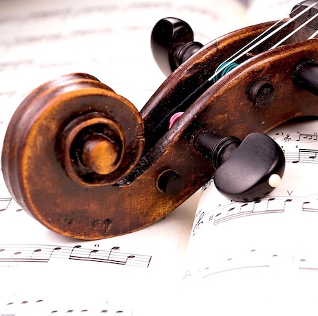 The dusty scroll of an old violin rests in the middle of a musical score. Only one line of music is in focus.
