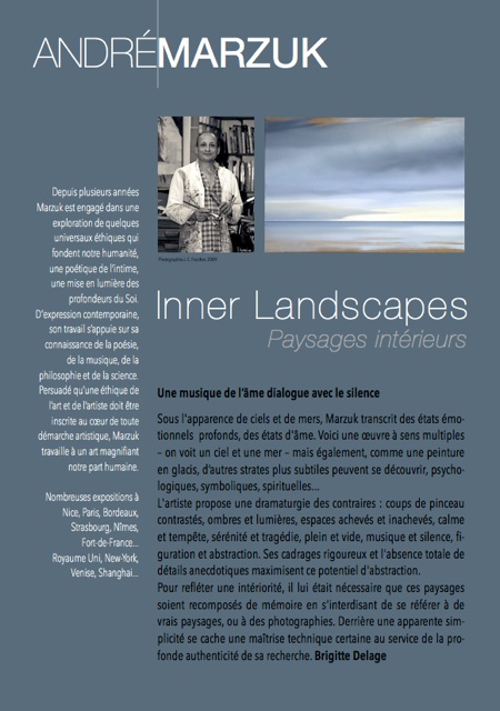 Depuis plusieurs années André Marzuk est engagé dans une exploration de quelques universaux éthiques qui fondent notre humanité, une poétique de l’intime, une mise en lumière des profondeurs du Soi. D’expression contemporaine, son travail s’appuie sur sa connaissance de la poésie, de la musique, de la philosophie et de la science. Persuadé qu’une éthique de l’art et de l’artiste doit être inscrite au cœur de toute démarche artistique, Marzuk travaille à un art magnifiant notre part humaine.
