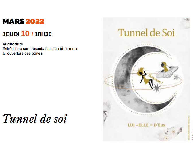 Clémentine et Martin se sont rencontrés il y a fort longtemps, dans… un rêve ! Ces deux aviateurs nocturnes (tapis volant pour l’un et soucoupe pour l’autre) ont mis un quart de siècle à se retrouver réellement. Tunnel de Soi raconte leur histoire en 4 tableaux. Aujourd’hui âgés, assis sur un banc, ils nous font revivre leur rencontre… Adolescents aux chemins de vies bien remplis (elle, amputée d’une main et agoraphobe, lui, compositeur au sommeil interdit), Clémentine et Martin sont tous deux enfermés dans un quotidien lourd de sens. Difficile pour eux de traverser leur pesante solitude… Le regard de l’autre ? Ils ne le perçoivent même plus.