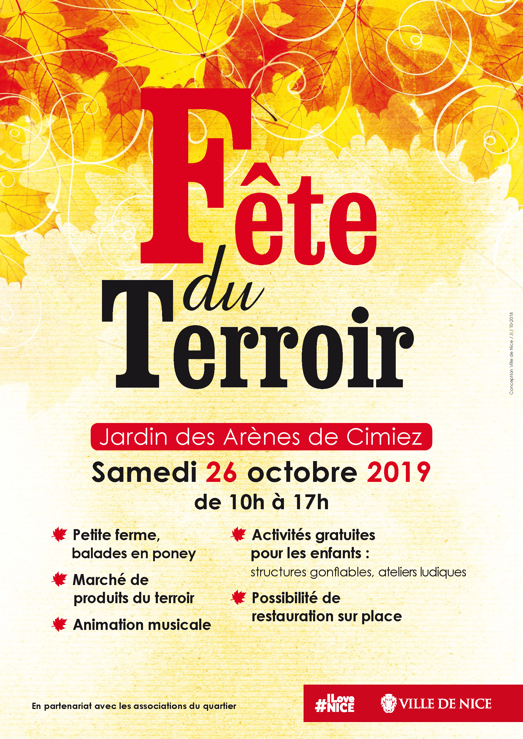 Dans une ambiance automnale festive, la Ville de Nice vous invite à participer à la 4ème édition de la Fête du Terroir ! Samedi 26 octobre 2019 à partir de 10 heures au Jardin des Arènes de Cimiez, venez partager un moment de saveurs et de convivialité autour des nombreux stands et ateliers d’animation qui font la richesse de notre région.