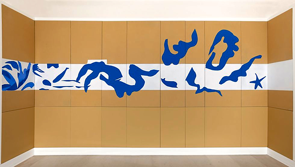 Cette composition a tout d’abord été réalisée en 1952 par Matisse en papiers gouachés découpés, sur les murs de sa salle à manger au Palais Régina à Cimiez (dernier lieu de vie de l’artiste à Nice). Il imagine une joyeuse scène de baignade.